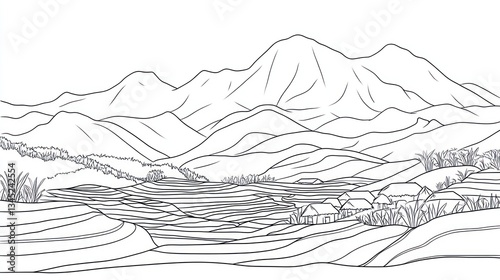landscape, mountain, rice, terrace, vale, asian, scenery, nature, drawing, illustration, mountain, outline, rural, view, outdoors, serenity, calm, peaceful, travel, hiking, trekking, journey, panorama, countryside, village, house, art, line art, black-and-white, vignetting, elevation, mountain chain, hill, drawing, graphic design, simplicity, black-and-white, vintage, minimalist