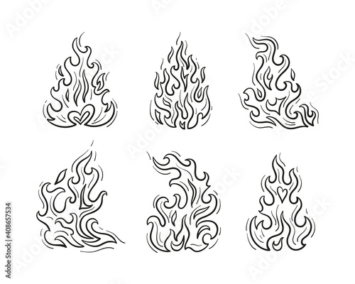 Outline Fire Flame Vector Set. Black and White Fire Flames Tattoo Icons Sketch Drawing