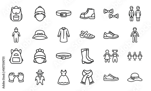 Outline Icon Set of Clothing and Accessories for Men, Women, and Children – Fashion Apparel Collection Including Shoes, Hats, Bags, Belts, and More – Minimal Line Art Style for Web, App, and Print Us