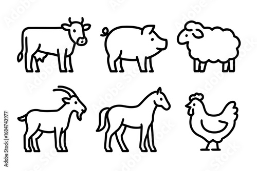 Outline illustrations of farm animals: cow, pig, sheep, goat, horse, chicken