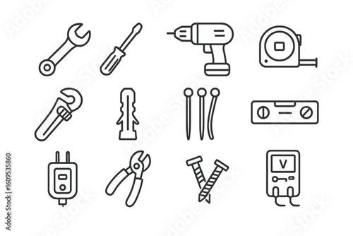 tool, outline, background, hand, dark, wrench, screwdriver, drill, tape, measure, plier, nail, screw, voltage, tester, spanner, hardware, equipment, bricolage, construction, repair, fix, work, industry, metal, black, grey, silhouette, mechanic