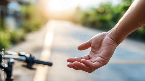 hand, outstretched, finger, palm, wrist, arm, bicycle, handlebar, bike, path, road, pavement, blur, bokeh, background, tree, greenery, light, sunlight, asphalt, blurred, depth of field, grip, vein, skin, daytime, journey, transportation, vehicle, cycling, sharpened, foreground, bright, surface, perspective, blurred background, out of focus, warm light
