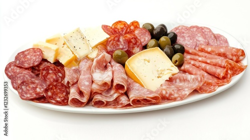 charcuterie, cheese, salami, olive, food, platter, delicious, tasty, party, snack, meat, epicure, catering, italian, mediterranean, cookery, culinary, gastronomy, receipe, dinner, lunch, brunch, breakfast, white, plate, oval, arrangement, sliced, cured, assorted, healthy, eating, lifestyle, picnic, buffet, eatery, dish, meal, closeup, studio, shot, background, composition