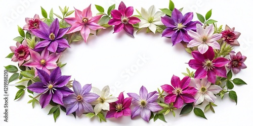 Oval Frame of Delicate Clematis Blossoms, Isolated on White Background - Perfect for Wedding Invitations or Spring Designs