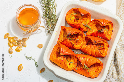 pumpkin, baked, oven, food, vegetable, meal, traditional, ingredient, dish, honey, rosemary, seed, trendy, modern, seasonal, autumn, greener, organic, natural, hot, white background, healthy, vegan, delicious, fresh, sweet, spicey, hokkaido, piece, slice, lunch, dinner, receipe, vegetarian, table, cookery, kitchen, orange, halloween, thanksgiving, fall, nourishment, diet, eating, ready to eat, cooked