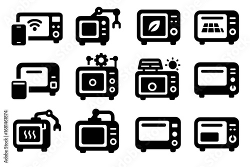 vector, icon, digital, robotic, nano, mini, oven, kitchen, cooker, automated, unit, cooking, appliance, culinary, baking, portable, toaster, virtual, heating, ai, compact, smart, precision, control, countertop, device, set, silhouette, pictogram, glyphs, symbol, solid, collection, black