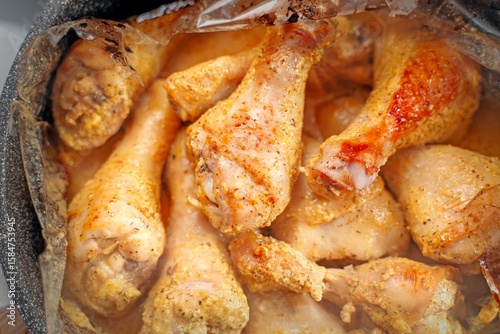Oven-baked chicken drumsticks removed from roasting bag, showcasing juicy golden-brown results