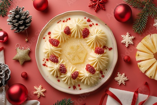 Over a very pale red setting, an overhead view of a plate of no-bake pineapple cream dessert depicting Christmas embellishments lovely food and space, Generative AI.