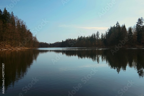 lake, water, landscape, sky, forest, tree, blue, river, tree, duck pond, autumn, cloud, summer, green, mirror, outdoors, cloud, scenic, spring, calm, wood, mountain, morning