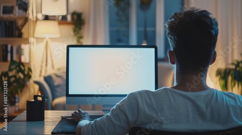 Over shoulder shot of a young man using computer laptop in front of an blank white computer screen in home