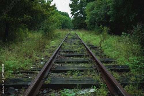 railway, track, train, overgrown, forest, green, lush, tree, wood, vegetation, nature, abandoned, rusted, old, weathered, wood, sleeper, rail, metal, decay, moss, leaf, branch, summer, solitude, quiet, peaceful, stillness, serene, calm, calmness, mystery, enigmatic, path, journey, destination, remote, wilderness, wild, secluded, forgotten, neglected