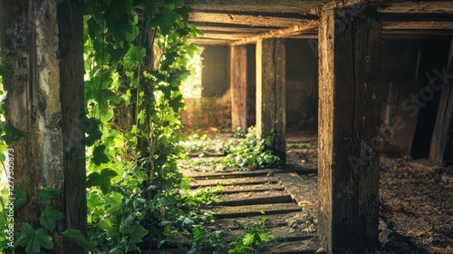 Overgrown Ruins with Ivy-Covered Wooden Beams and Sunlight Glow