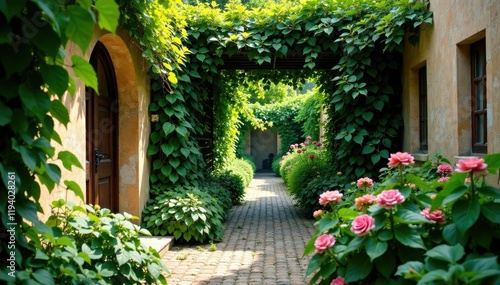 Overgrown trellis with vines and flowers in a courtyard, overgrowth, weeds