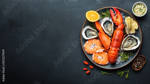 seafood, lobster, oyster, shrimp, plate, food, meal, dinner, epicure, delicious, fresh, ocean, eatery, cookery, culinary, luxury, fine dining, dark background, topview, grey background, food photography, still life, gastronomy, health food, protein, elegant, epicure, closeup, table setting, receipe, cooking, eat, dining, crab, seafood