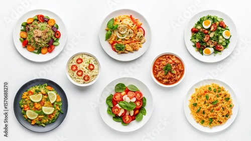 Overhead shot of eight vibrant and healthy meal options: salads, pasta, and rice dishes, perfect for a diverse menu or diet plan.