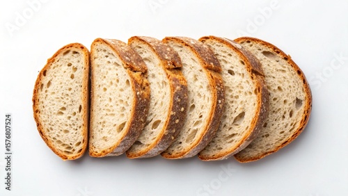 Overhead shot of five slices rustic sourdough bread, light beige crumb, crisp crust, isolated white background.