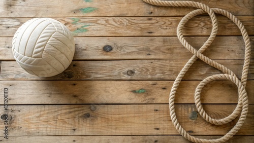Overhead View of a Beautiful Bosbattle Rope Ball on Rustic Wooden Surface - Soft Feminine Aesthetic with Copy Space for Design Elements