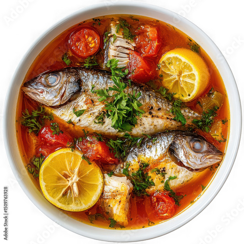 Overhead view of a bowl of fish stew with tomatoes lemon and parsley in a white ceramic bowl dish on transparent background