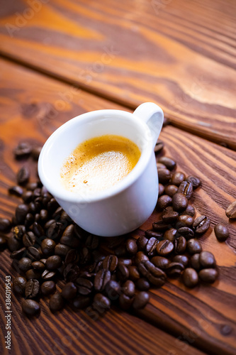 Overhead view of a freshly brewed mug of espresso coffee on rustic wooden background with woodgrain texture and roasted coffee beans
