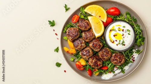 meatball, food, plate, meal, lunch, tasty, dish, epicure, cookery, cooking, delicious, freshness, ingredient, lemon, ripe, cut, tomatoes, green, sauce, yogurt, garnish, oil, herb, parsley, pepper, small, table, view, healthy, nourishment, diet, culinary, eatery, vegetarian, organic, dinner, background, roasted, grilled, brown, salad, rocket, preparation, serving, fresh