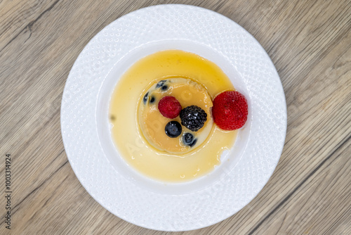 Overhead view of Italian dessert after dinner is beautifully arranged panna cotta topped with rasberry, blackberry, and strawberry