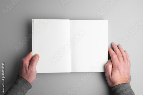 book, person, opening, open, hand, page, blank, empty, template, overhead, desk, grey, copy space, man, caucasian, hardcover, paper, advertisement, marketing, booklet, novel, textbook, handbook, studying, learning, reading, business, education, topview, mock-up, simplicity, document, booklet, holding, white, table, surface, media, information, advertising