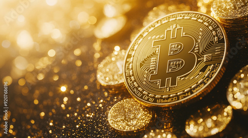 Overhead view of stacked golden Bitcoin coins with a prominent Bitcoin logo in the center, surrounded by smaller coins, set against a background of blurry light and dark tones.