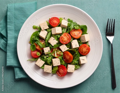 overhead, view, tofu, salad, tomatoes, white plate, fresh, healthy, vegetable, food, vegetarian, meal, health food, alimentary, colourful, vegan, lunch, food photography, organic, dietary, vegetarian dish, vegetable salad, protein, healthy eating, wholesome, greener, healthy lifestyle, plate
