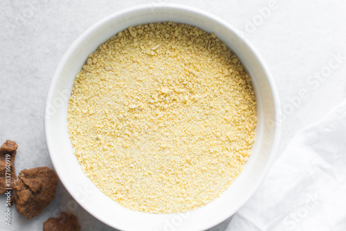 Overhead view of Yellow garri in a white bowl, top view of nigerian garri in a ceramic bowl, fried cassava, garri for eba
