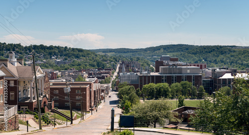 building exterior, campus, city, city landscape, downtown, craggy, landscape, overview, panorama, river, skyline, summer, sunny, sunshine, town, town center, tree, west virginia