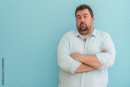 Overweight man in a tight shirt on a light blue background, Embracing Body Positivity, The Beauty of Individuality, Breaking Fashion Barriers, The Power of Inclusivity