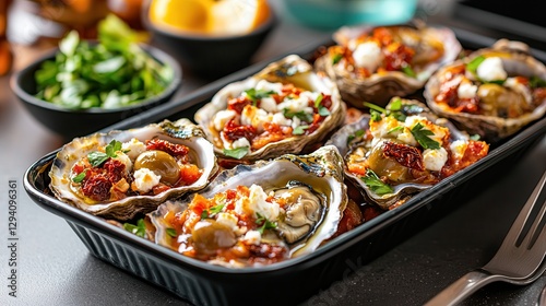 Oyster seafood appetizer grilled to perfection. Baked oysters topped with herbs and spices on a serving tray.