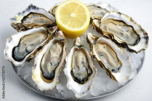 Oysters and shellfish shine at seafood festivals. Fresh oysters on ice with a lemon slice for garnish.