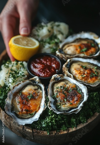 oyster, fresh, lemon, champaign, seafood, fine dining, meal, platter, woman, hand, squashes, mollusc, raw, luxury, deli, eatery, table, fish, portion, sauce, ice, healthy, dinner, lunch, mediterranean, bivalve, cooking, snack, delicious, epicure, french, cookery, glasses, onion, squashes, dripped, shell, mussel, nourishment, crustacean, cafes, dining, epicure, texture, detail, sharpened, lighting, composition, motion