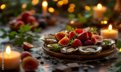 oyster, strawberry, fig, plate, food, fruit, dinner, meal, fresh, wooden, rustic, delicious, display, healthy, eating, dessert, red, pink, warm, light, evening, still life, summer, seasonal, composition, arrangement, close, up, image, eatery, presentation, background, natural, ingredient