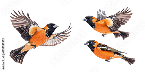 Pack Stunning Black-Headed Grosbeak in Flight Set in Different Poses on Transparent Background for Wildlife, Nature, and Bird-Themed Designs