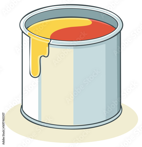 Paint Can Filled with Yellow and Red Colors Dripping Paint, Open Container, Cartoon Illustration