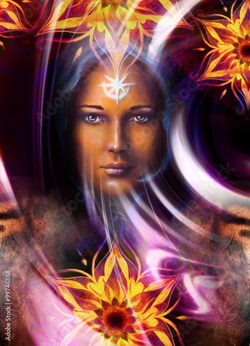 painting mighty tiger head on ornamental background and mystic woman face, computer collage.