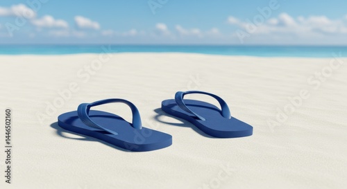 Pair of blue flip-flops on pristine white sand at a serene beach with azure sea and sky
