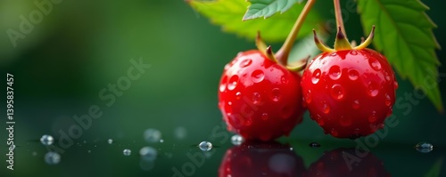 Pair of bright red berries with water droplets glistening, agriculture, juicy