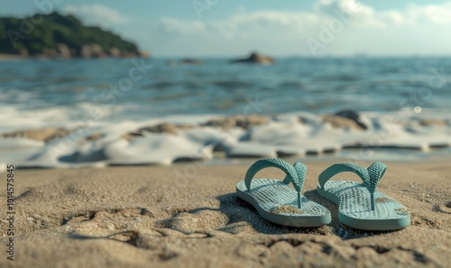 Pair of flip-flops on the beach, 4K hyperrealistic photo