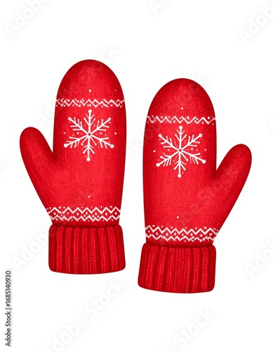 mitten, red, winter, snowflake, warm, cosy, knitted, wool, pattern, design, christmas, holiday, illustration, graphic, hand-drawn, fabric, texture, isolated, white, snow, pair, decoration, decorative, cute, gift, accessory, warmth, hand, protection, comfort