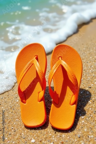 Pair of vivid orange flip flops on golden sand near ocean waves , vibrant, summer vibes, ocean waves