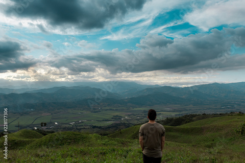 mountain, landscape, heaven, nature, horizon, hill, cloud, hiking, blue, people, grass, travel, outdoors, view, green, summer, field, woman, hike, standing, excursionist, t-shirt, ambulatory, view