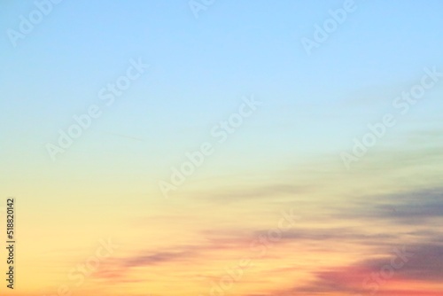Paisaje creado por el cielo al atardecer. Nubes disipadas entre los colores azul, amarillo y rojo de la puesta de sol.