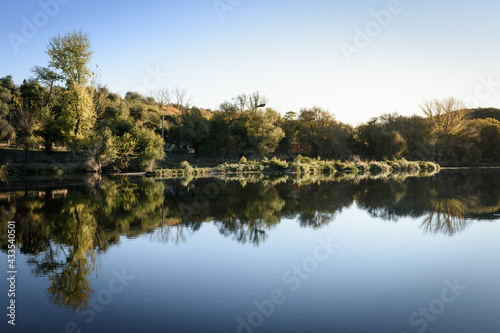 Paisaje simétrico en el estanque del río. Reflejos del bosque sobre la laguna.