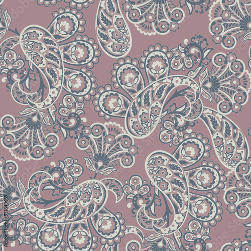 Paisley seamless pattern. Fantastic flower, leaves. Batik style painting. Vintage background