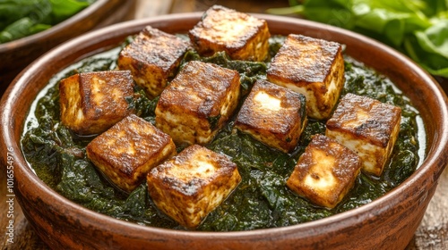 Palak Paneer, con cubos de paneer dorado sobre una salsa espesa de espinacas, servida en un tazón de barro, lleno de sabores indios.