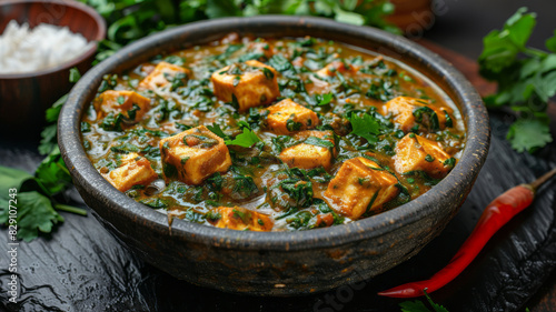 Palak Paneer indian traditional food with cheese and spinach on black background, view from above,generative ai