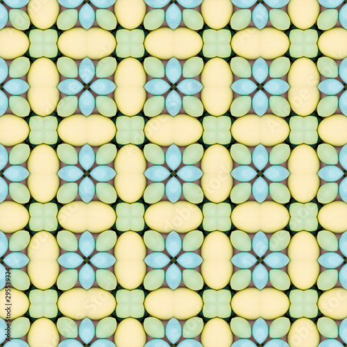 background, pattern, seamless, tile, repeat, wallpaper, pale, pink, green, yellow, flower, flower petals, geometric, mosaic, detail, abstract, texture, design, modern, shape